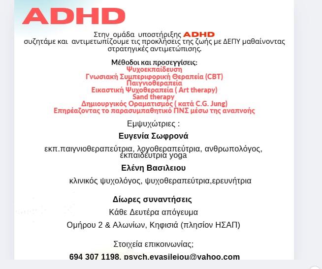 Στην ομάδα υποστήριξης ADHD συζητάμε και αντιμετωπίζουμε τις προκλήσεις της ζωής με ΔΕΠΥ μαθαίνοντας στρατηγικές αντιμετώπισης.